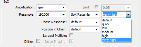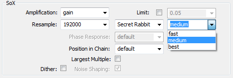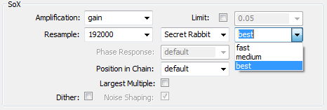 The options to configure SoX correspond to the SoX command line (cf. SoX man page):