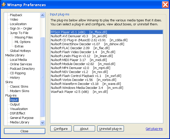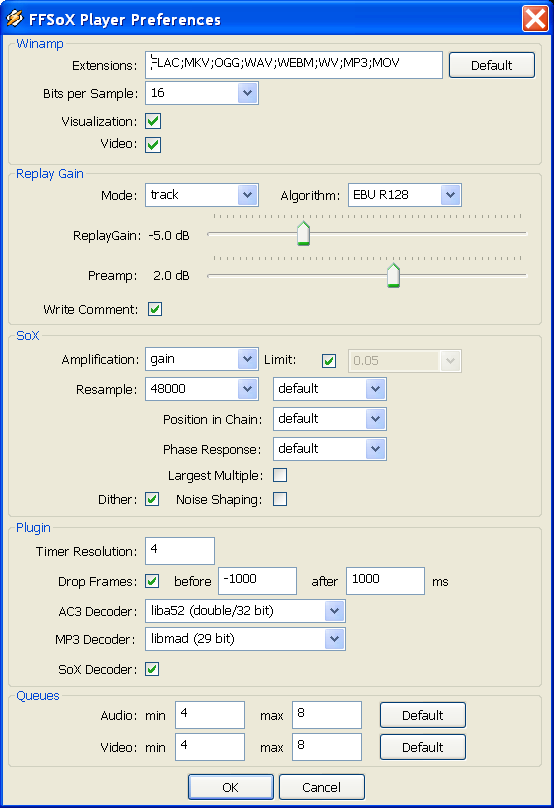 FFSoX Player is a Winamp input plug-in based on the FFmpeg and SoX libraries. Using FFmepg almost all multimedia files may be played with Winamp, including but by far not restricted to H.264 and VP8. Audiophile sound processing is provided using high quality 32 bit SoX algorithms and dithering.